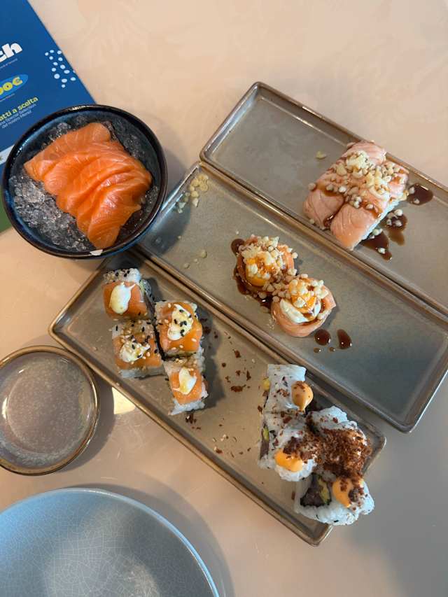 - Salmone (2pz), tonno (2pz), gambero (1pz), salsa ponzu e olio evo, sesamo ed erba cipollina