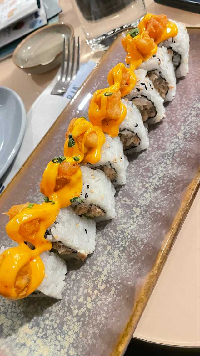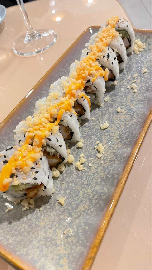 - Alga nori e riso sushi bianco in / gambero in tempura, mayo, cipolla fritta, avocado, spicy mayo e salsa teriyak