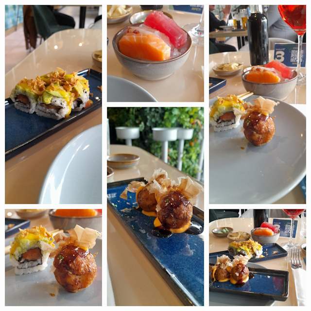 - Sashimi di salmone (2pz), sashimi di tonno (2pz), sashimi di gambero (1pz)