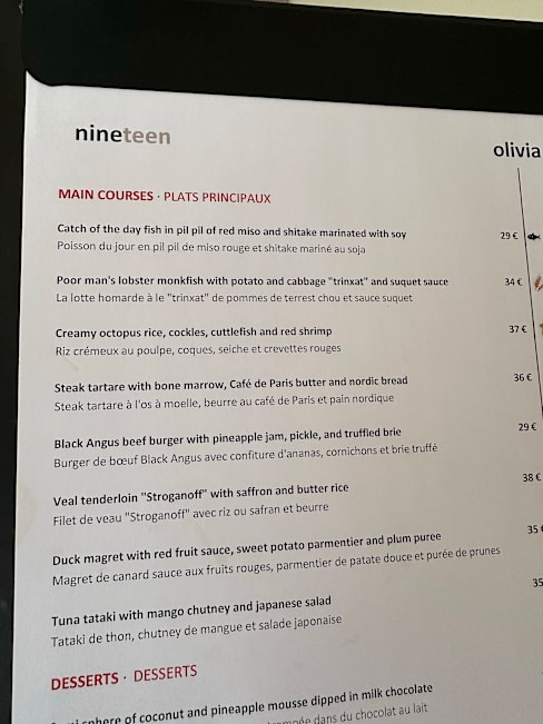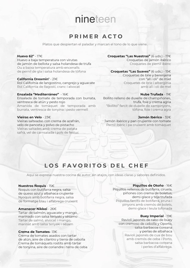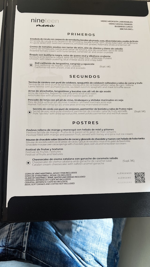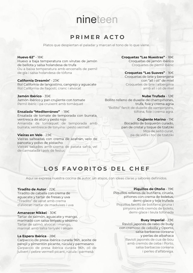 10/10Our group of four had an absolutely stellar evening at Nineteen Restaurant in Barcelona! Dining on their lovely terrace was a treat, with its cozy yet vibrant ambiance setting the perfect tone. The service was outstanding—warm, attentive, and seamless, ensuring our group felt well taken care of throughout the meal. The food was great: the rape was fresh and exquisitely prepared, the bacalao was packed with rich, authentic flavors, and the steak was cooked to absolute perfection, each bite a delight. Every dish showcased the chef’s talent and dedication to quality. Nineteen is a true Barcelona treasure, and we can’t recommend it enough for an unforgettable group dining experience!