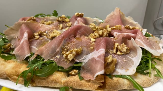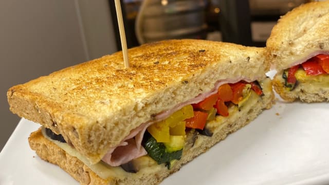 Pane toscano ai cereali*, verdure grigliate, prosciutto, formaggio
