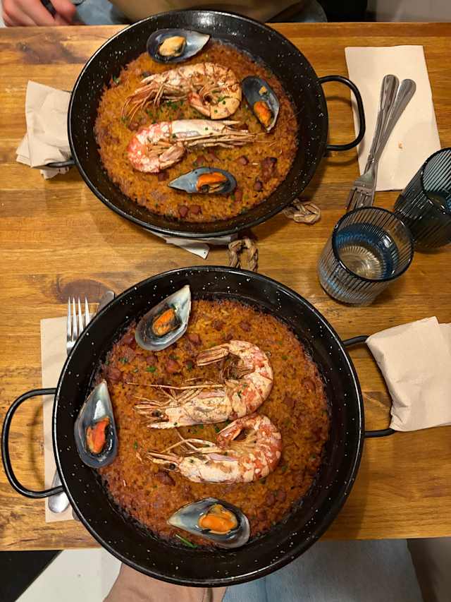 Paella de mariscos, hecha con sofrito de tomate, cebolla, sepia, gambones del mediterráneo, mejillones y arroz del delta del Ebro.