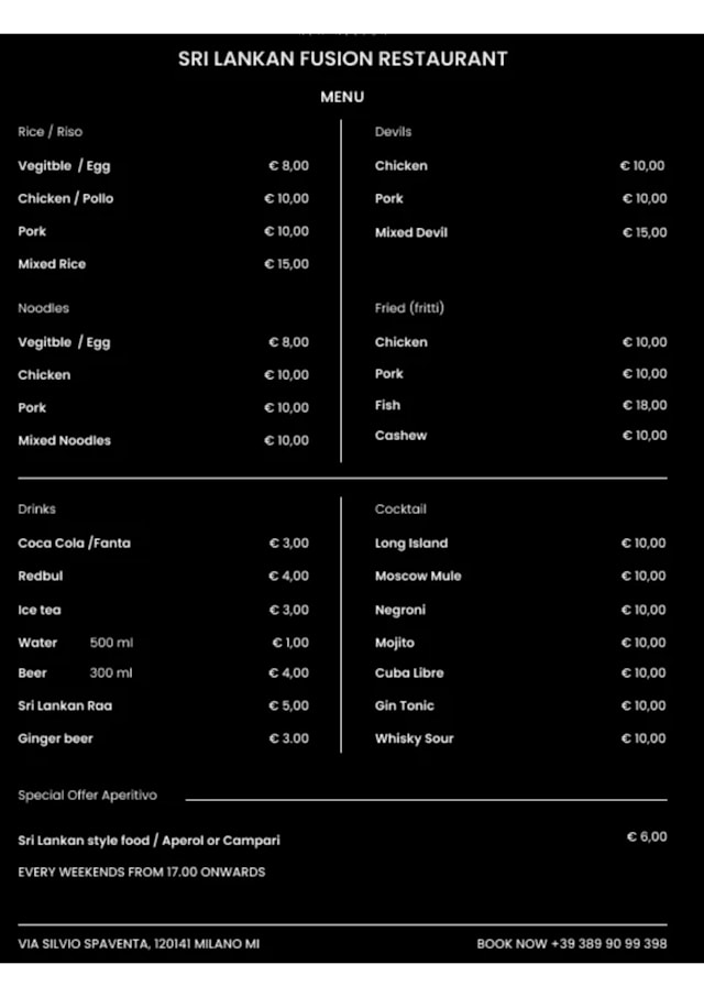At NN Sri Lankan Fusion experience with dishes that blend Sri Lankan flavors with Italian and global influences. They are known for their fresh, aromatic dishes and a loyal following among food lovers, menu includes dishes like Fired Rice, Devilled chicken and Pork Fired cashew.