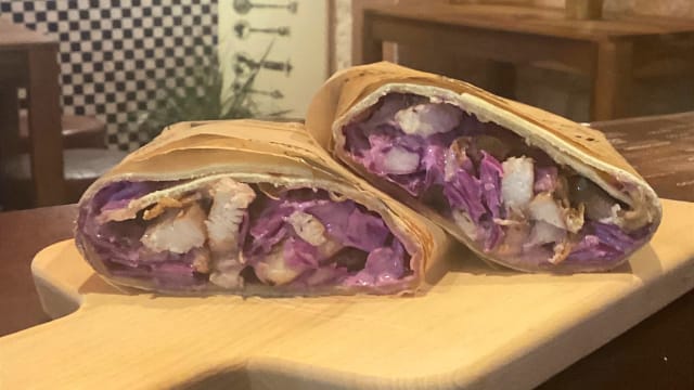 Patata viola 180gr, salsa avocado, fior di latte, pomodori, insalata