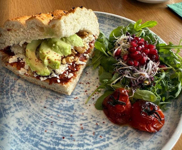 Turks brood met smashed avocado, muhammara, tulum kaas, walnoten, geroosterde cherrytomaten en rode olijfolie