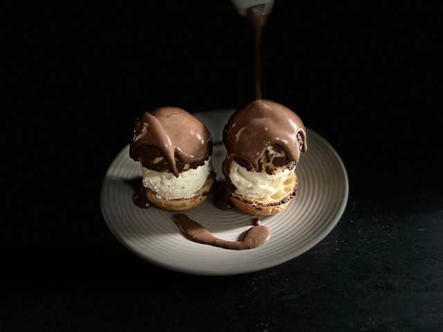 - Brioche dorée et moelleuse façon « pain perdu », servie avec une boule de glace vanille et son caramel onctueux au beurre salé