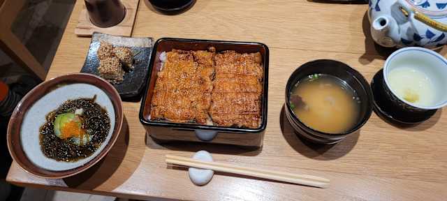- ASUNARO (280 g anguille grillée avec riz, salade aux algues mozuku et flan d'anguille au sésame blanc)