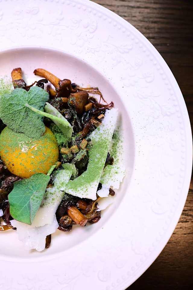 - Champignons poêlés, bouillon, poutargue et légumes d’hiver