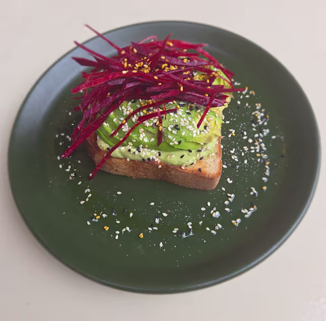 - Créme d’avocat, avocat sclicé, gomasio, julienne de betterave