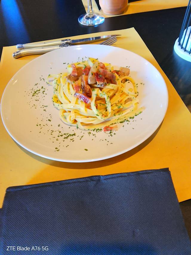 - Fettuccine fatte a mano con guanciale DOP, funghi porcini e una spolverata di prezzemolo