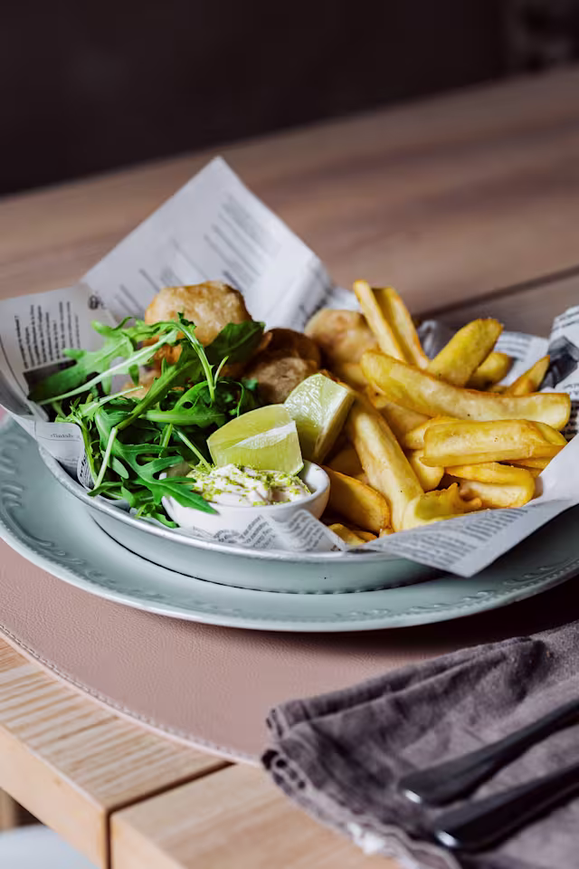 - Filetto di merluzzo nordico, pastellato homemade, con patate fritte, insalatina e maionese al lime.