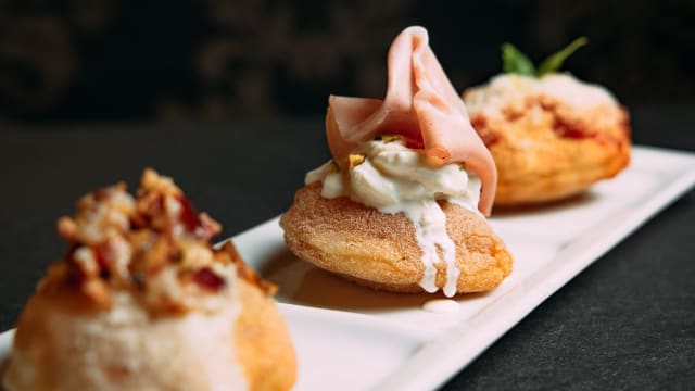 Tris di burratine: mortadella con pesto di pistacchio | salmone e lime | crudo, noci e miele