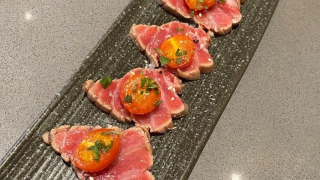 Tataki toro: ventresca de atún con tomates cherry a la plancha