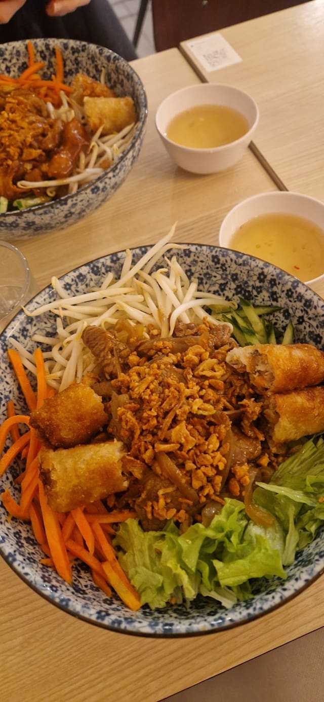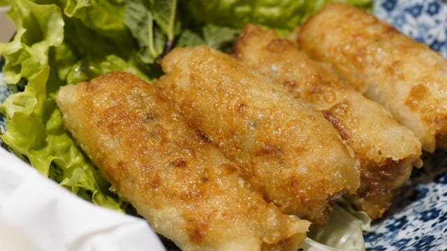 Tofu 5 parfum, nems aux légumes, vermicelles de riz, salade, soja, carotte, concombre, menthe, cacahuète, oignons frits