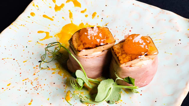 2 peças de arroz envolvido em atum, no topo foie gras braseado com compota de abóbora