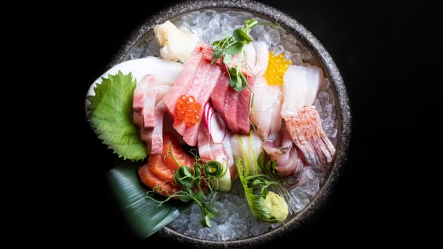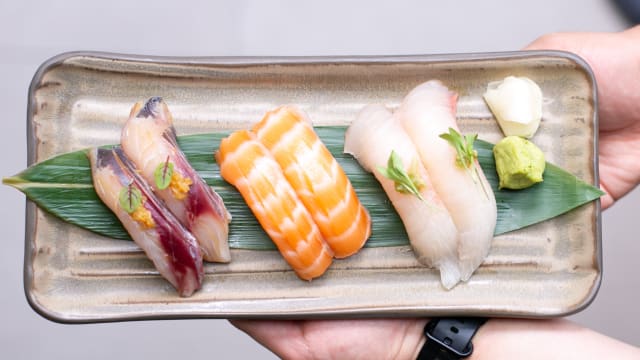 10 peças de sashimi e 10 peças de sushi incluindo nigiris, uramakis e hossomakis