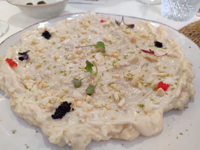- Ensaladilla de corvina con mayonesa de lima y huevas de pez volador
