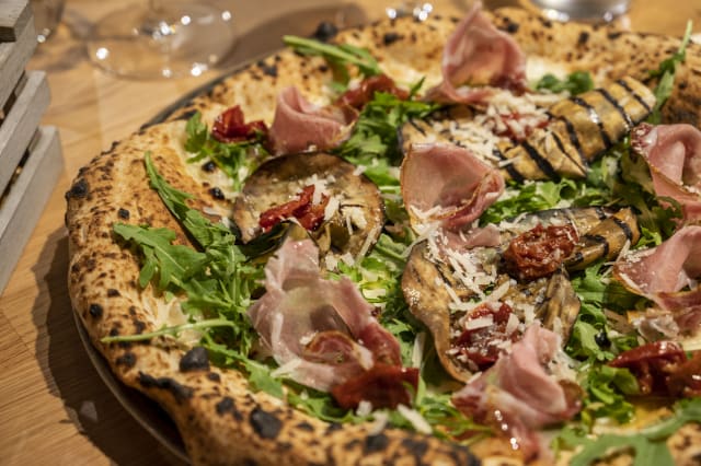 Salsa di pomodoro, bufala, crudo, burrata, granella di noci, bordo ripieno di noci e philadelphia