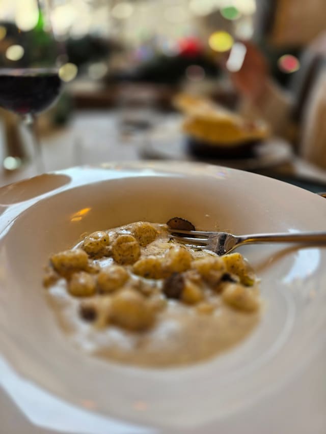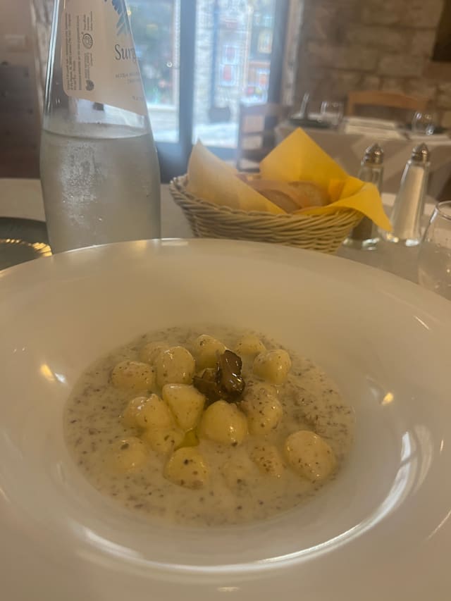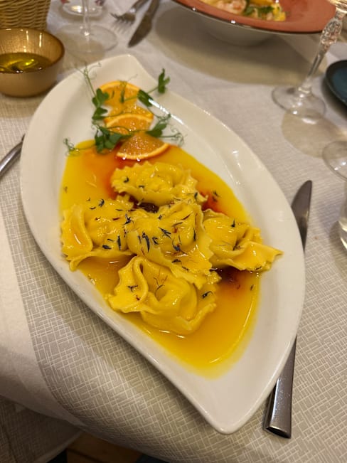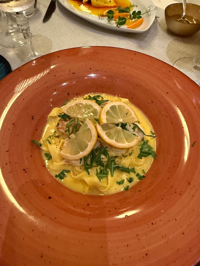 10/10The host was welcoming and accommodating! The food was amazing. We had a Scarmazo cheese with truffle in a red sauce - no meat during Lent. My husband had a stuffed ravioli with bufalo mozzarella and beets while I had tagliatelle with limone and prawns- both excellent! We paired a local white wine which was a blend of grechetto, chardonnay, viogner, and vermentino- delicate yet flavorful! Be aware of the ‘coperto’ charge- not sure if it is a gratuity or a a tax… I would have asked if I had looked at the bill. Lovely restaurant!