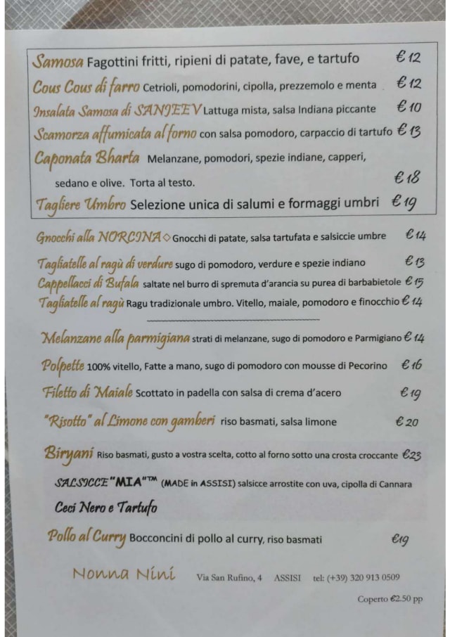 10/10At Nonna Nini you have 3 amazing food options - straight up Umbrian food made to perfection; Indian food made to perfection and a fusion of Umbrian and Indian, which is also amazing. I highly recommend this if you're looking for great Italian/Umbrian food or if you want something different and delicious, Sanjeev's Indian food!