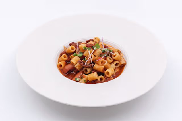- Moscardino alla luciana con pomodoro ciliegino san marzano, olive, capperi e crostino di pane