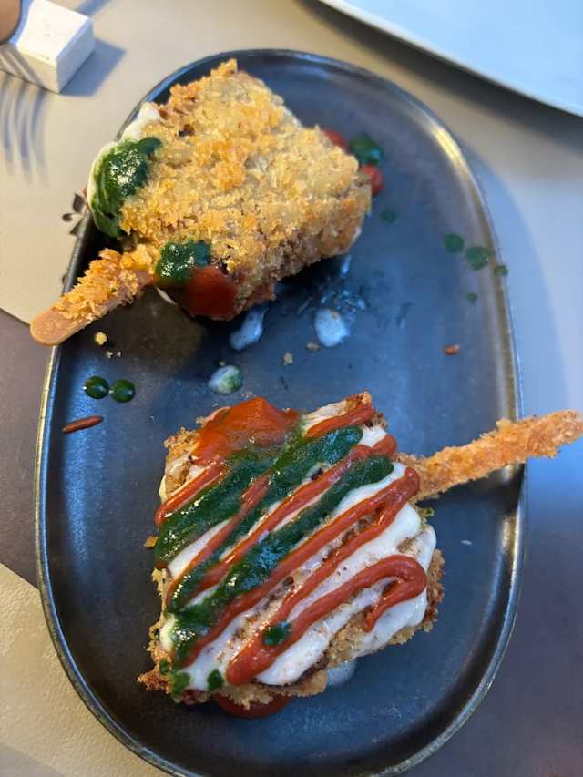 - Bon bon di maialino home made in crosta croccante, serviti su cremoso al cheddar e salsa BBQ affumicata. (2pz)