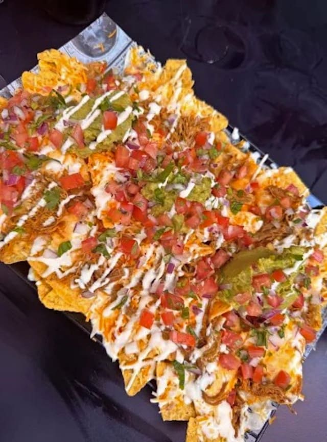 Montaña de nachos crujientes con mezcla de tres quesos, carne desmechada, guacamole, pico de gallo, salsa agria y jalapeños.