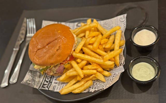 170grs de carne vacuno, queso cheddar fundido, bacon ahumado y salsa nosara. Una combinación clásica que nunca falla