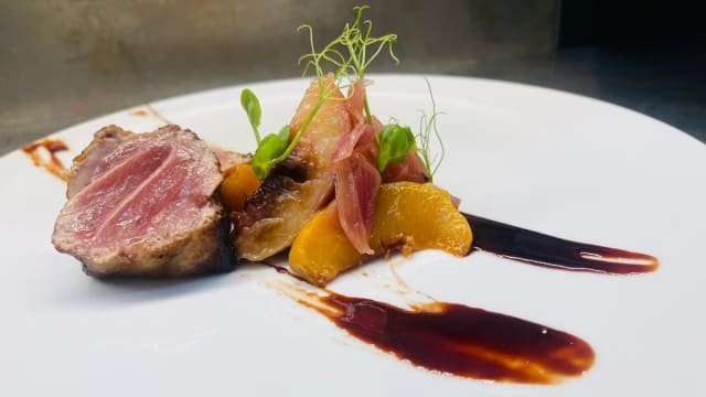 La guancia di manzo brasato, prugne alla brace e salsa d'arrosto