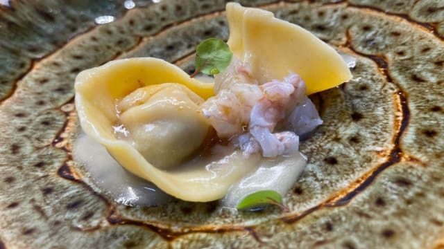 Il tortello scampi e albicocche alla brace, su burro acido
