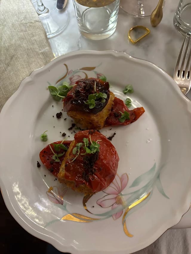 Con san marzano bruciato, basilico e polvere di olive taggiasche.