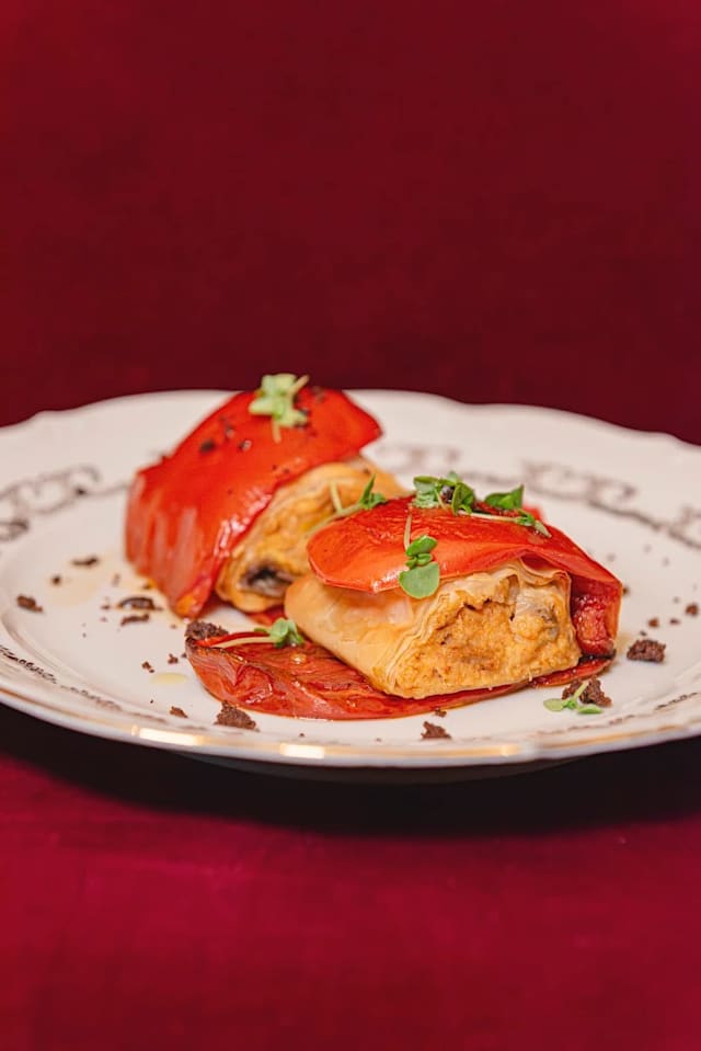 Ripieno di patate, zucchine romanesche, mentuccia e limone, su crema cacio e pepe.