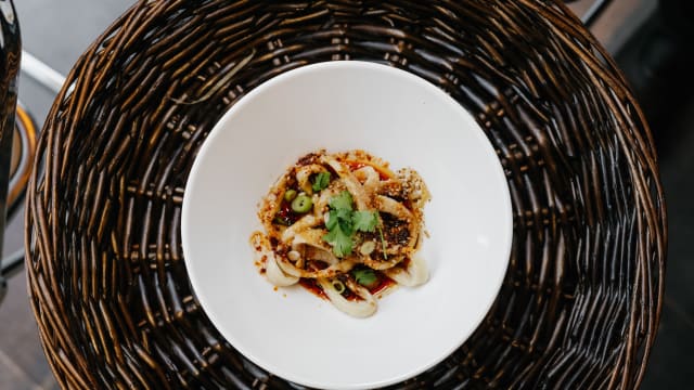Salade au poulet effiloché, vinaigrette de poivre vert sichuanais.