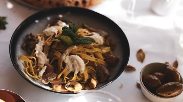 Pâtes fraiches maison, crème de truffe noire, lardon fumé et jaune d'œuf.