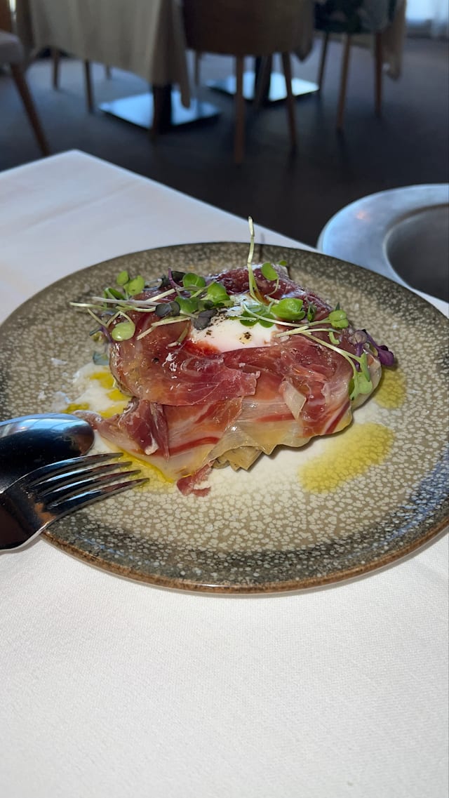 Milhojas de patata trufada con huevo a baja temperatura y lascas de jamón