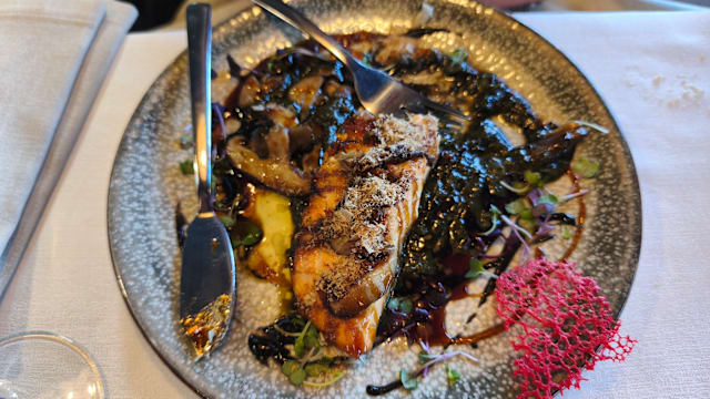 Salmón fresco a baja temperatura con terminación a la parrilla con setas y salsa verde
