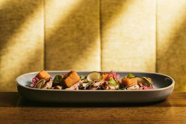 - Polvo com batata-doce, cebola roxa e coentros.