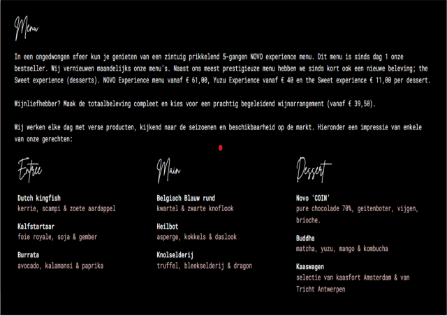 9.5/10It was an amazing culinary experience. The finess and innovational cuisine is remarkable. The wine recommendation was excellent. The staff was very kind and friendly. We had lunch with our 4 year old daugther, which can be tricky in a "fine dining" restaurant, but not at Novo, they adabted the dishes (smaller portions, less herbs and spices) from the 3 courses menu for her so that she really enjoyed the food. The value-for-money ratio is incredible. A visit at Novo will definetely be on our agenda next time we'll visit Maastricht.