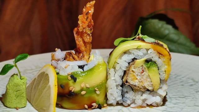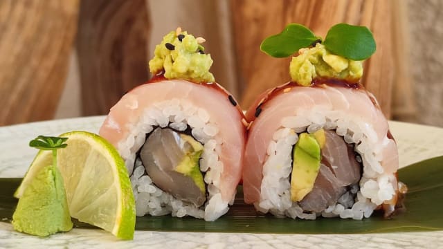 Tonno pinna gialla, anguilla giapponese grigliata, avocado e teriyaki