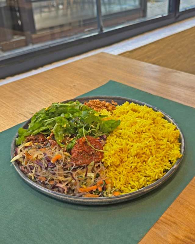 - Arroz basmati con babaganoush, hummus, guacamole, granada, pepino, perejil y tzatriki,