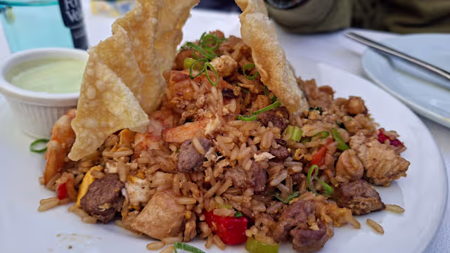 - Arroz con trozos de pollo, langostinos, ternera y huevo, con especias orientales.
