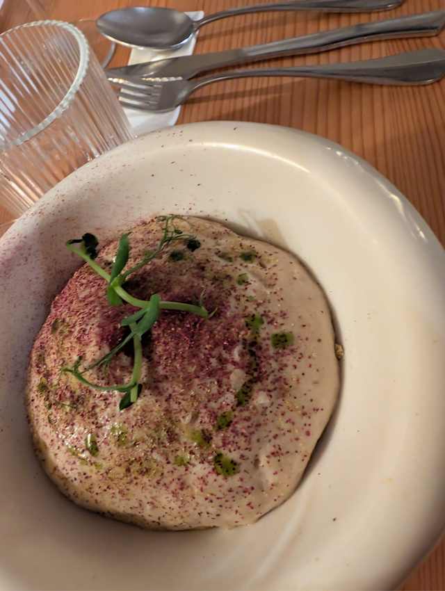 - Boutons de mortadelle fraîche, beurre fumé, réduction de poivre, pomme de terre violette et prosciutto