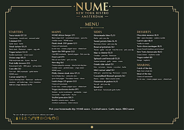 10/10+3This was our first time at NUME Amsterdam, it sits in a monumental building, a very nice location, super friendly and attentive staff, the service was excellent, with an incredibly tasty dishes. we checked the menu online on Google maps beforehand, and we went there already knowing what to order, however their menu was recently changed, (we wanted to order the scallops, and the lamb shank) but they are not included in the new menu, nevertheless, the dishes we ordered were super delicious and didn’t disappoint at all. I highly recommend this restaurant and we will definitely get back soon to try the rest of the dishes.