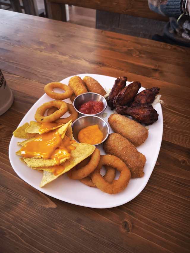 - Buffalo wings, onion rings, jalapeños, nachos con cheddar