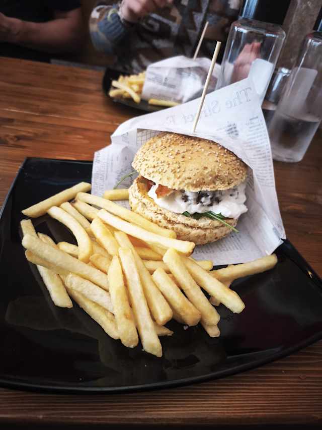 - Burger di verdure, scamorza, salsa harissa, patè d’olive.Zola, insalata, pomodoro, cipolla