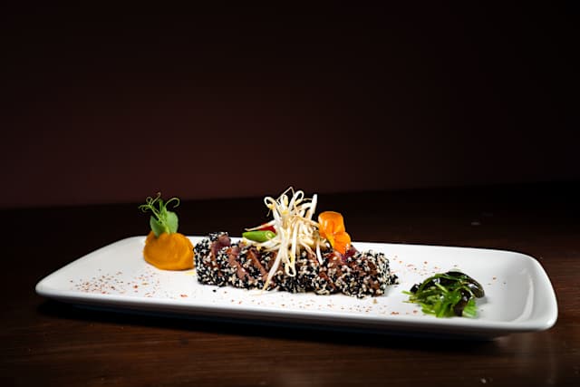 - Tonno in crosta di sesamo bianco e nero, salsa Teriyaki BBQ, crema di zucca e mango, alghe Wakame e germogli di soia.