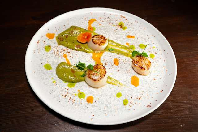 - Capesante scottate, crema di asparagi e porri profumata alla vaniglia.