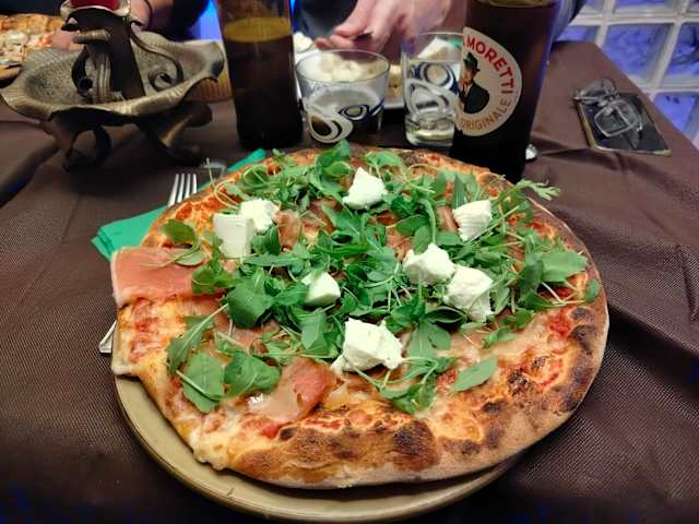 - Pomodoro san marzano, fior di latte, crudo, rucola grana a scaglle