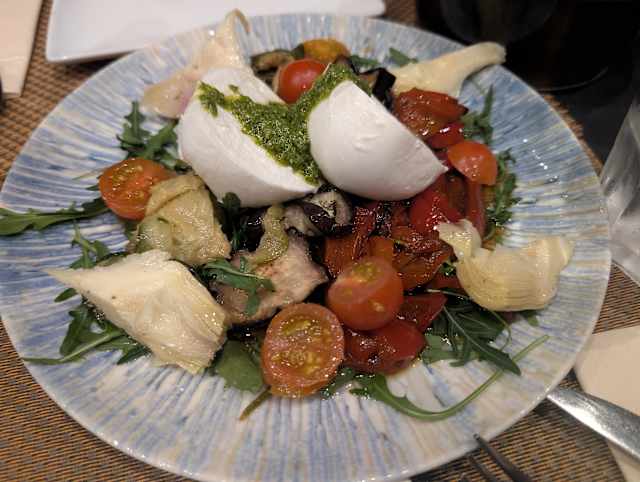 - La mozza sous toutes ses formes: bufala tréssée, stracciatella,burrata, roquette, pomodorini et pesto
