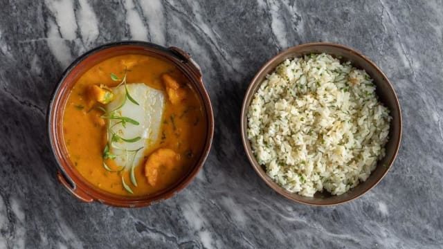 Carabineiro, camarão black tiger, bacalhau, mandioca, leite de coco e arroz de alho